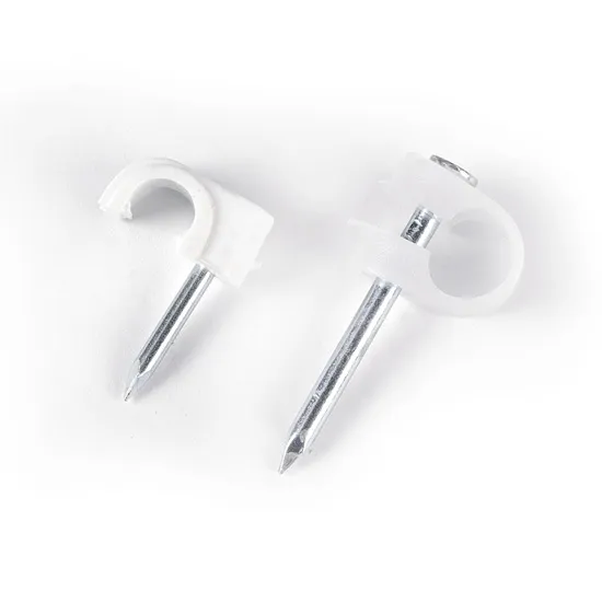Abraçadeira aberta com uma parte plástica de forma semicircular e parafuso em aço, que permite fixar o cabo coaxial contra a parede ou solo.