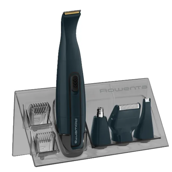 Aparador de barba ideal para estilizar Wet&Dry: pode ser usado no duche Lâminas com revestimento em Titânio Cabeça de aparar estreita para barba (20 mm) 1 Cabeça Mini-shaver 1 Cabeça de aparar nariz e orelhas 1 Cabeça de corte preciso com 25 mm 2 pentes: 3 mm e 6 mm Bolsa de transporte