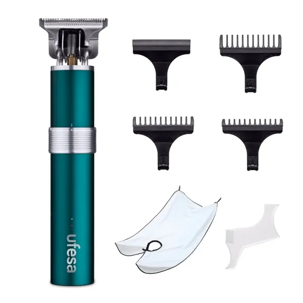 Lâmina em forma de T: 40mm Lâmina de aço inoxidável 3 pentes fixos para cabelo e barba: 1/2/3 mm Estêncil multiforme 8 em 1 para cabelo e barba Avental de barba incluído Bateria de litio de longa duração Autonomia: 180 min Tempo de carga: 3h Cobertura protectora da lâmina Indicador LED de carga e indicador de bateria fraca Com ou sem fios Cabo USB