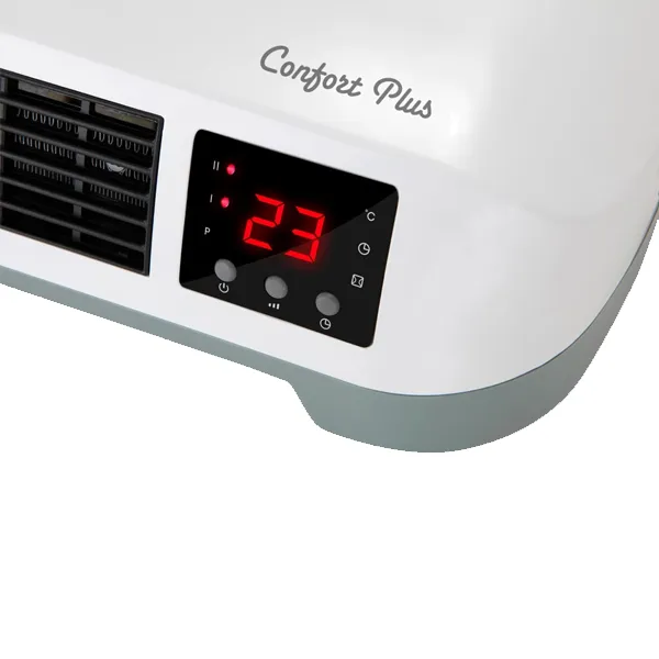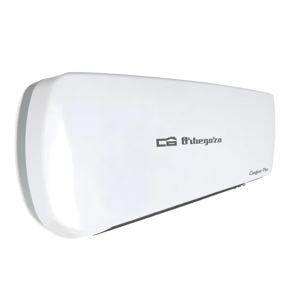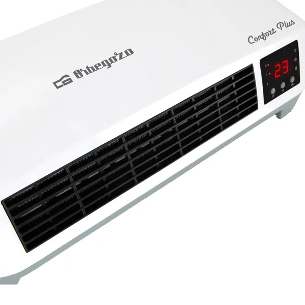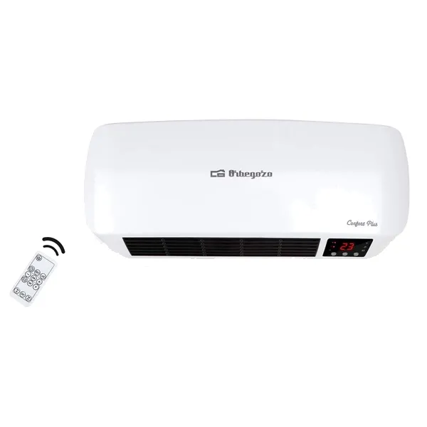 Aquecedor de parede split Potência máxima: 2000 W. Banheiro especial: IP-22. Elementos cerâmicos PTC. 2 níveis de aquecimento: 1000 – 2000 W. Modo ventilador. Programável: diariamente e semanalmente. Função de detecção de janelas abertas. Proteção contra superaquecimento. Interruptor de desconexão total. Termostato digital. Montagem na parede. Controle remoto. Indicador do painel LED. Medidas: 460 x 185 x 110 mm. Conexão: 220 – 240 V ~ 50 Hz.
