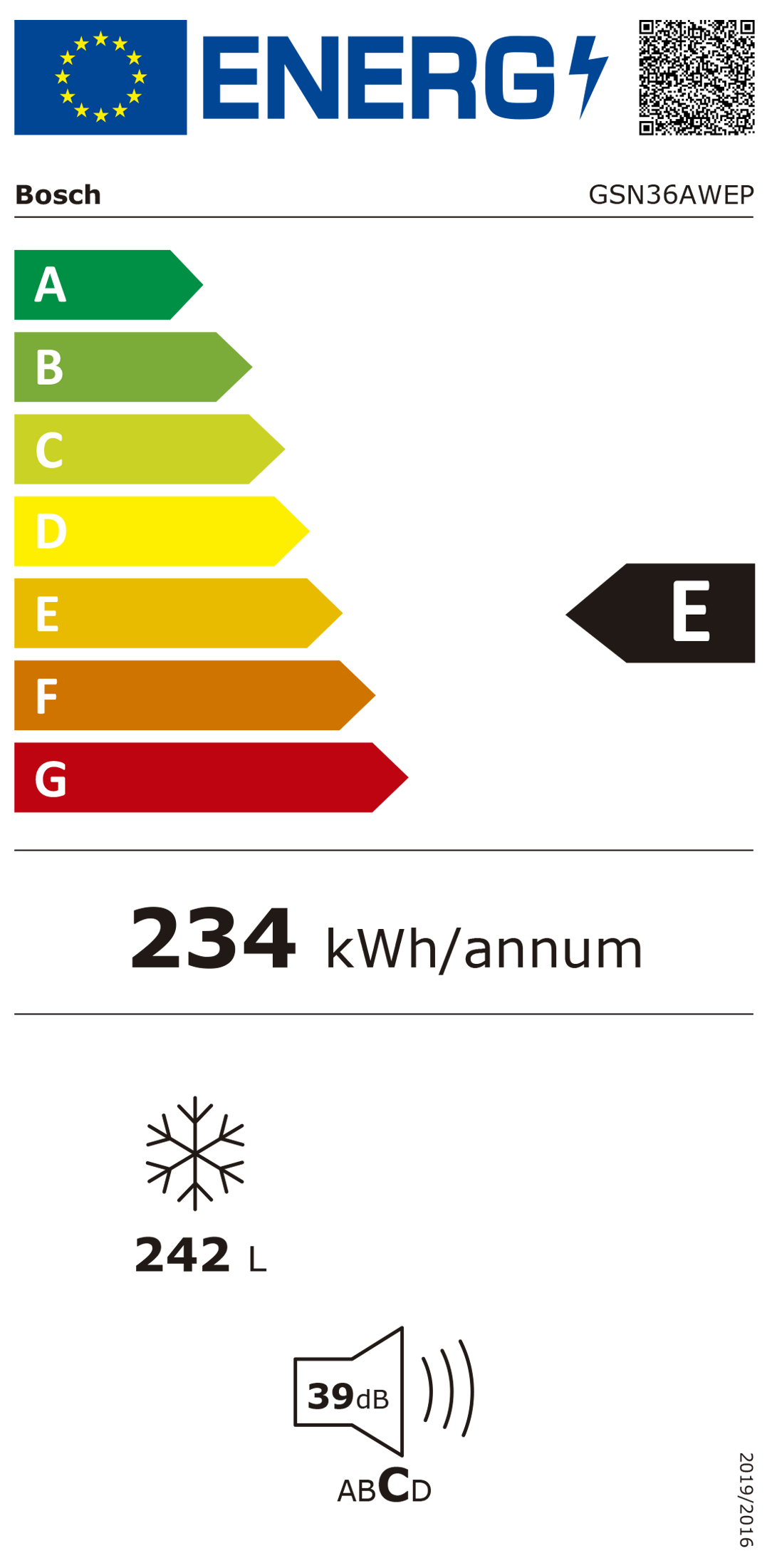 CONSUMO / CAPACIDADE Classe de eficiência energética: E Consumo anual de energia (kWh/ano): 234 kWh/ano Volume líquido total : 242 litros Emissão de ruído (dB(A) re 1pW): 39 dB