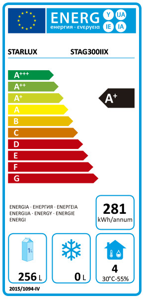 Classe climática: 4 Classe temperatura: M1 (+5ºC) Capacidade garrafas (0,50lts) max: 200 Volume útil: 256 lts Volume bruto: 304lts Gama temperatura: 3ºC / 10ºC Refrigerante: R600a Voltagem e frequência: 220-240 / 50 V/Hz Potência: 200W Corrente nominal: 1,20 Classe energética: A+ Índice de eficiência energética: 24,2% Consumo de energia (kWh/24h): 0,77 Consumo de energia (kWh/ano): 281 Cor do aro: Cinzento Número de tampas: 3 Tampas de correr Termómetro Rodas Esgoto frontal Dimensões (axlxp): 820x1060x670mm Aspecto: Branco com tampas opacas inox