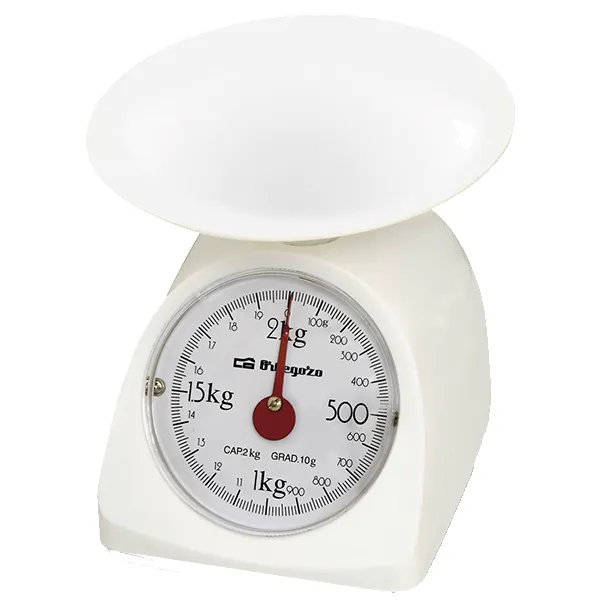 Balança de cozinha mecânica. Superficie de plástico lisa. Capacidade max: 2kg. Escala: 10g.