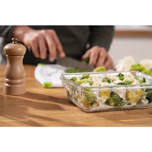 Caixa hermética de vidro borossilicato: resistente ao calor e a elementos químicos Função 5 em 1: preparar, cozinhar, servir, manter fresco e transportar alimentos Sistema de fecho 100% hermético, higiénico e seguro, mantém a frescura dos alimentos por mais tempo Proteção contra descoloração e odores Compatível com forno até 420ºC, micro ondas até 100ºC, congelador até -40ºC e máquina de lavar louça Produto com selo certificado para comida de bebé Sem BPA