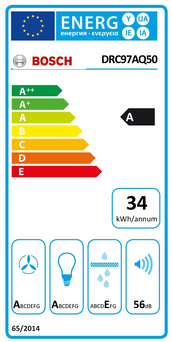 CLASSE DE EFICIÊNCIA ENERGÉTICA Classe de eficiência energética: A numa escala de classes de eficiência energética de A++ até E Consumo anual de energia: 34 kWh/ano Classe de eficiência de dinâmica dos fluidos: A Classe de eficiência de iluminação: A Classe de eficiência de filtragem de gorduras: E Ruído MIN./MAX. no nível normal: 41/56 dB