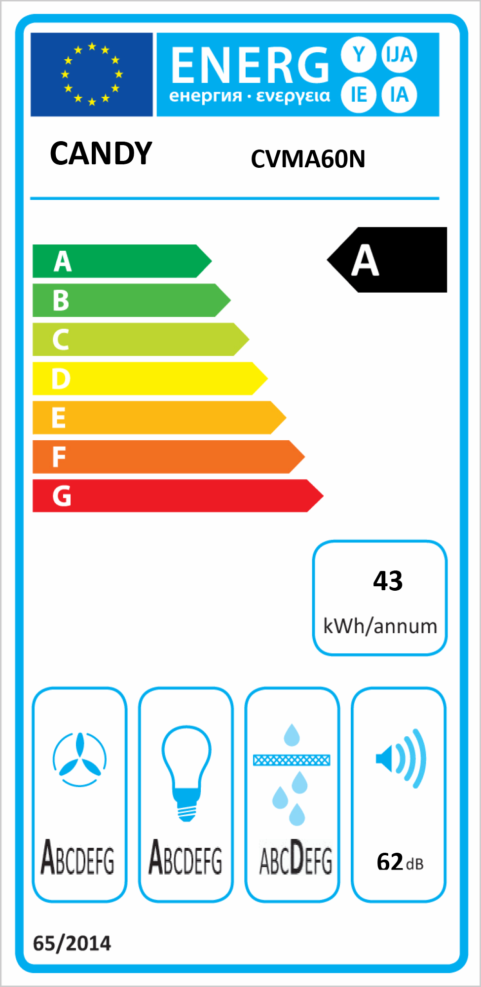 DESEMPENHOS Classe de eficiência energética: A Consumo anual de energia: 43 kWh Nível de ruído: 62 dBA Minimo fluxo de ar: 407 m3/h Máximo fluxo de ar: 502 m3/h Fluxo de ar na função Booster: 611 m3/h Nível de ruído EN 60704 – Minimo: 58 dBA Nível de ruído EN 60704 – Máximo: 62 dBA Nível de ruído EN 60704 – Booster: 67 dBA