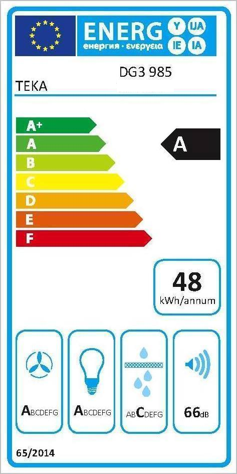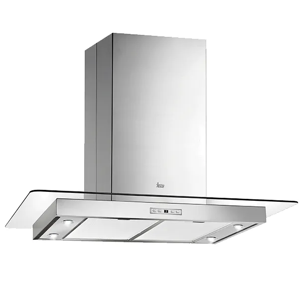 Chaminé decorativa para instalação em ilha Painel de comandos eletrónico retroiluminado com display digital branco 4 lâmpadas LED Três velocidades + uma intensiva Indicador digital de velocidade selecionada Programação do tempo de aspiração Filtros metálicos decorativos em inox Indicador luminoso de saturação de filtros Estrutura superior em vidro reforçado Motor blindado de dupla turbina Válvula antirretorno Capacidade de extração: min. 311 m3/h – máx. 796 m3/h Nível de potência sonora: min. 52 dBA – máx. 66 dBA Possibilidade de funcionamento em recirculação (SET 1/T + adaptador) Classificação energética: A Vidro