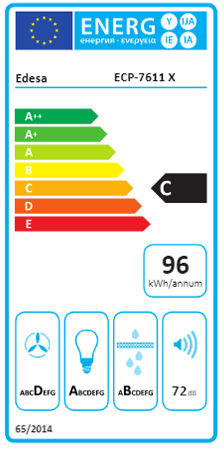 Chaminé decorativa de 70cm Eficiência energética: C 3 níveis de extração Comandos mecânicos Capacidade de extração máx / min: 645 / 385 m3/h Nível sonoro máx / min: 71,8 / 57,8 dB(A) 2 lâmpadas de iluminação LED, Classe A Filtros metálicos laváveis na máquina de lavar louça Válvula anti-retorno incluída Dimensões (axlxp): 720 – 1020x700x50mm Cor: Inox