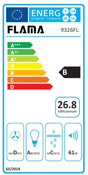 Tipo de exaustor: Chaminé Ø saída (mm): 600 mm Tipo de luz interior: LED Consumo de luz interior (w): 2 W Tensão (v): 220/240 v Frequência (Hz): 50 Hz Potência máxima exaustor (W): 66,5 W N.º de motores: 1 Potência do motor (W): 65 W Estilo: Chaminé Válvula anti retorno Dimensões: 60 cm x 48,2 cm x 14 cm Consumo anual de energia (kWh/a): 26,8 kWh/a Classe de eficiência energética: B Eficiência dinâmica dos fluidos: 15,8 Classe de eficiência dinâmica dos fluidos: D Eficiência de iluminação: 37 Classe de eficiência de iluminação: A Eficiência de Filtragem de gorduras: 77,7 Classe de eficiência de filtragem de gorduras: C Caudal de ar (velocidade mínima em utilização normal): 255 Caudal de ar (velocidade máxima em utilização normal): 351 Nível de potência sonora com ponderação A (velocidade mínima em utilização normal): 55 dB Nível de potência sonora com ponderação A (velocidade máxima em utilização normal): 61 dB Número de filtros: 2 Descrição do filtro: Aluminio 5 camadas Número de velocidades: 3