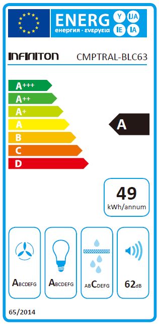 Classificação energética: A Consumo energético anual (kWh/ano): 50,2 Consumo energético diário (kWh/dia): 0,138 Capacidade de extração(m3/h): 800 Potência de extração máx. (W): 253 Potência do motor (W): 250 Potência de luz (W): 2x 1.5W Diâmetro interior tubo de ar (cm): 12/15 Ruido (dB): 64 Dimensões: 53,5x60x42cm Painel Touch 3 níveis de potência de sucção Modo Booster Cor: Vidro Branco