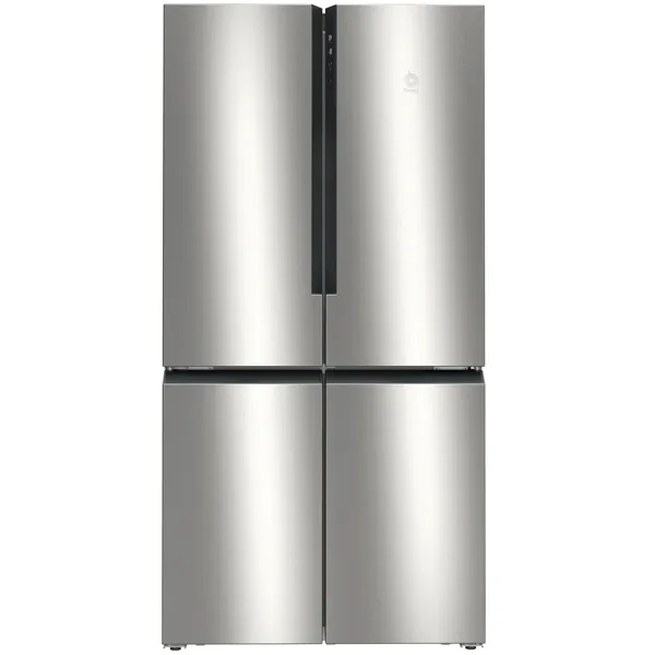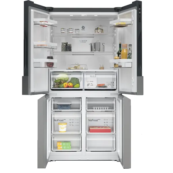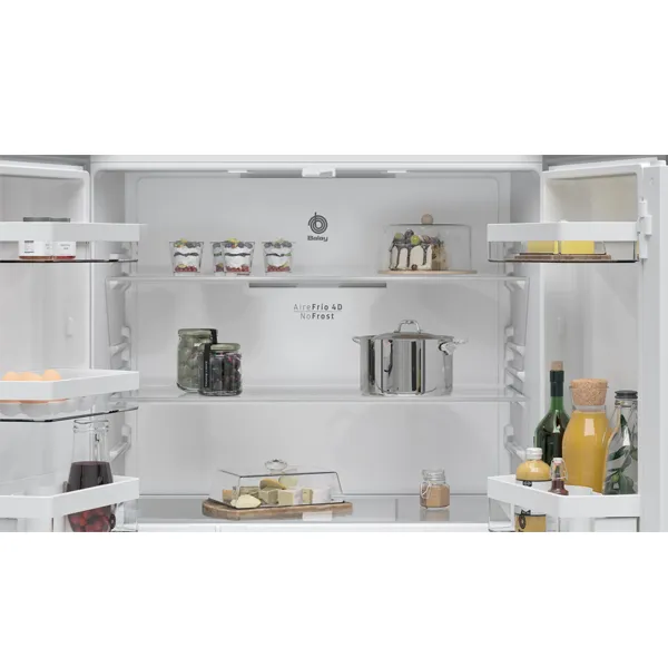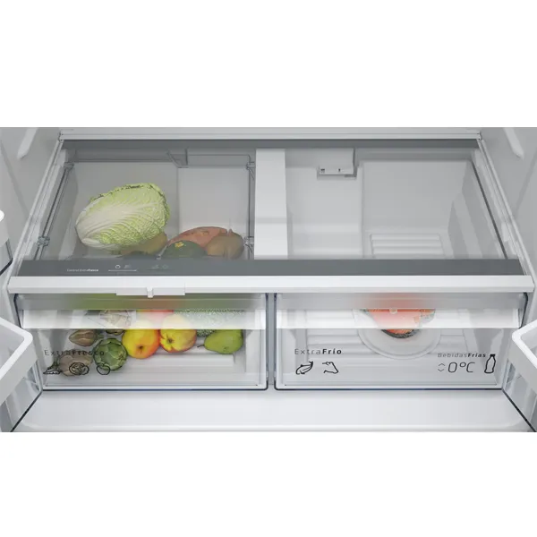 Tipo de constrição: Livre Instalação Cor principal do produto: Inox-easyclean Abertura da porta: À esquerda + À direita Tipo de dobradiça: Dobradiça plana Tipo de puxador: Puxador integrado horizontal e vertical NoFrost Tipo de definição de controlo e de indicadores: Aviso de avaria congelador, Aviso porta aberta congelad., Avisos Congelador, Indic. temperat.p/congelação, Indic. temperat.p/refrigeração, Interruptor supercongelaç., Interruptor super frigorifico. Classe de eficiência energética: E Consumo médio anual de energia em kilowatt-hora por ano (kWh/a): 333 kWh/annum Soma do volume dos compartimentos de refrigeração: 405 l Soma do volume dos compartimentos de congelação: 200 l Emissão de ruído aéreo: 38 dB(A) re 1 pW Classe de emissão de ruído aéreo: C Classe climática: Subtropical, Temperado, Temperado ampliado, tropical Número de prateleiras no compartimento de refrigeração: 3 Número de prateleiras ajustáveis no compartimento de refrigeração: 2 Nº suportes de ovos: 3 Número de estrelas ou compartimento congelador: 4 Autonomia em caso de falha de energia (h): 15 h Número de gavetas/cestos: 6 Dimensões do produto: 1830 x 910 x 731 mm