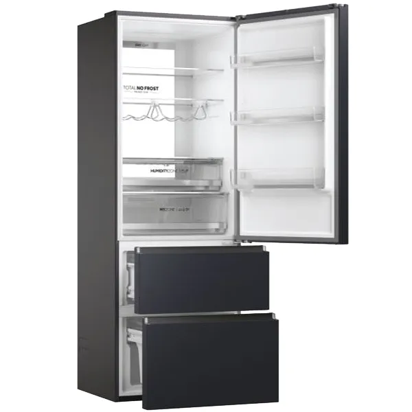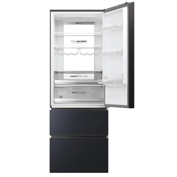Instalação: Instalação livre Categoria de Produto: Frigorífico Tipo de produto: 3 portas Tecnologia de frio: No Frost Painel Conetividade: Controlo Remoto App IoT: hOn Coluna de circulação de ar Multiflow Processo de descongelação da secção do frigorífico: Automático Processo de descongelação da secção do congelador: Automatica no frost Chiller – Fresh zone Corrente (A): 1.5 Frequência (Hz): 50 Voltagem (V): 220-240 Interface de comando: Eletrónico Localização dos comandos: Painel comandos na porta Indicador de porta aberta – frigorífico: Acústico Temperatura ajustável: Frigorífico – congelador Congelação rápida Férias Smart cool Função Super refrigeração Cor/Material do corpo: Black Dobradiça da porta: Right-mounted Número de gavetas de congelação: 2 Frigorífico com ventilador interno Material das prateleiras: Vidro Prateleiras da porta: Perfil em metal Material das prateleiras da porta: Plástico cristalino Acabamento das prateleiras: Perfil em silver Número total de prateleiras da porta: 3 Portas reversíveis Pegas: Pegas integradas confortáveis Porta garrafas: Dobrável vinho rack Luz: Led Número de gavetas: 1 Número de suportes para os ovos: 1 branco Número de covetes para gelo: 1 transparente Número de prateleiras ajustáveis no compartimento do frigorífico: 3 Classe Energética: E Classe de ruído: C Nível de ruído dB(A): 37 Consumo anual de energia: 301 Classe climática: SN Capacidade total do compartimento de refrigeração (l): 343 Capacidade total do compartimento de congelação (l): 140 Capacidade total (l): 483 Autonomia em caso de falha de energia (h): 12 Altura: 2006mm Largura: 700mm Profundidade: 675mm