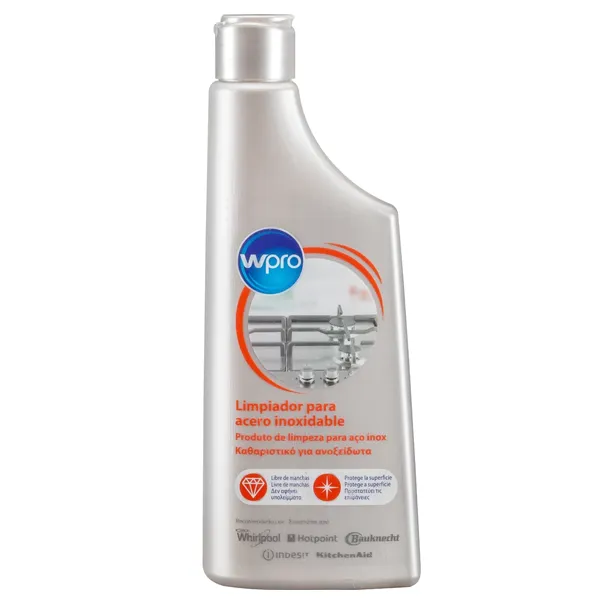 A fórmula de limpeza profissional em creme Wpro limpa e protege eficazmente todo o tipo de superfícies em aço inoxidável, ao aplicar uma camada protetora que é também à prova de água. O creme tem uma agradável fragrância a limão. 250 ML