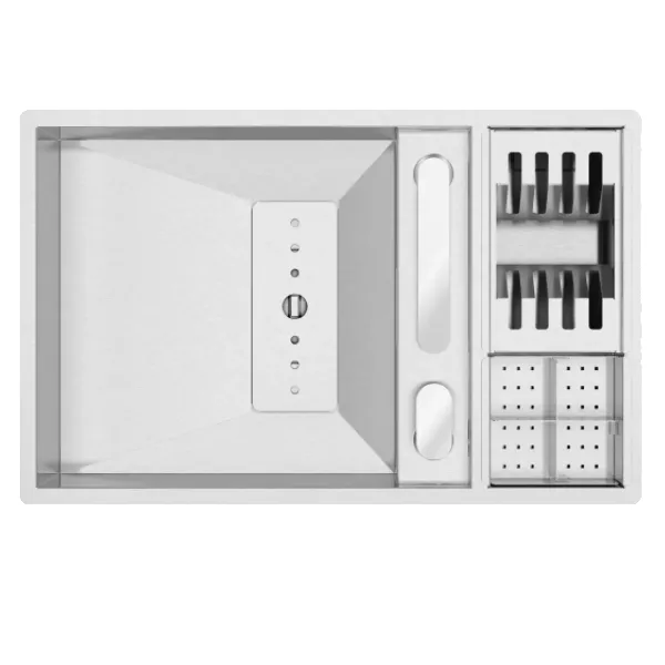 Medida externa: 690x440mmMedida das cubas: 400×400/150x400mmProfundidade: 200/100mmFornecido Com: Sifão/Válvula manual FIRST 0212247S + 872900 + Misturadora BT0QS3000CR + Tampa de válvula InvisibleTamanho do móvel: 800mm