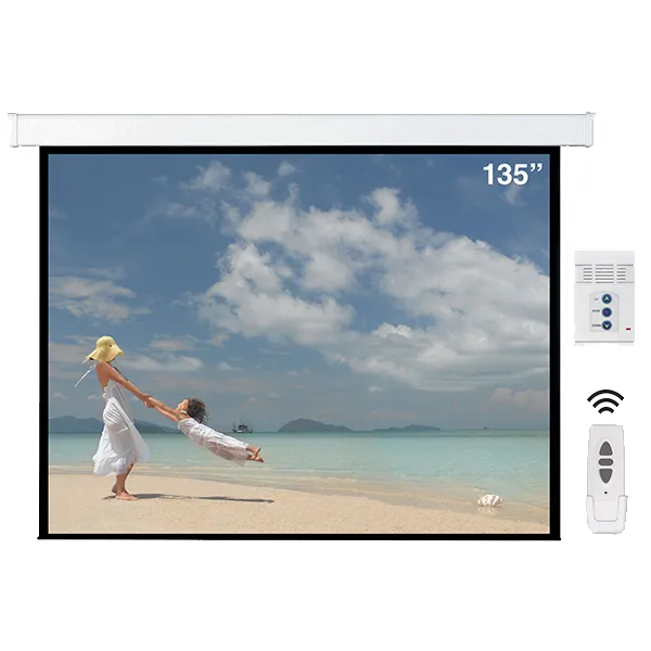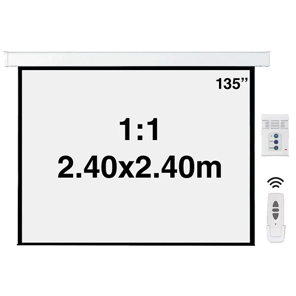 Ecran de projeção 135 Relação: 1:1 Possibilidade de fixação à parede e ao teto Blackout (Costas Pretas) 4 black borders (moldura preta) Tela Matte White Travamento automático Comutador de parede e comando via rádio Motor tubular silencioso 220V Dimensão Imagem (LxA): 2400X2400mm Dimensão tela (LXA): 2480X2720mm DROP: 4cm