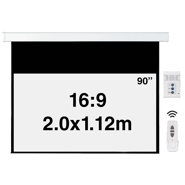Ecran de projeção 90 Relação: 16:9 Possibilidade de fixação à parede e ao teto Blackout (Costas Pretas) 4 black borders (moldura preta) Tela Matte White Travamento automático Comutador de parede e comando via rádio Motor tubular silencioso 220V Dimensão Imagem (LxA): 2000X1120mm Dimensão tela (LXA): 2080X1440mm DROP: 4cm Top DROP: 30cm