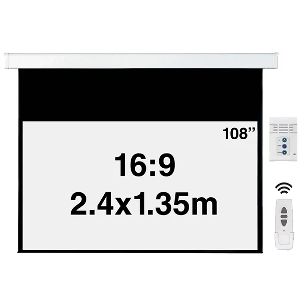 Ecran de projeção 108 Relação: 16:9 Possibilidade de fixação à parede e ao teto Blackout (Costas Pretas) 4 black borders (moldura preta) Tela Matte White Travamento automático Comutador de parede e comando via rádio Motor tubular silencioso 220V Dimensão Imagem (LxA): 2400X1350mm Dimensão tela (LXA): 2480X1670mm DROP: 4cm Top DROP: 30cm