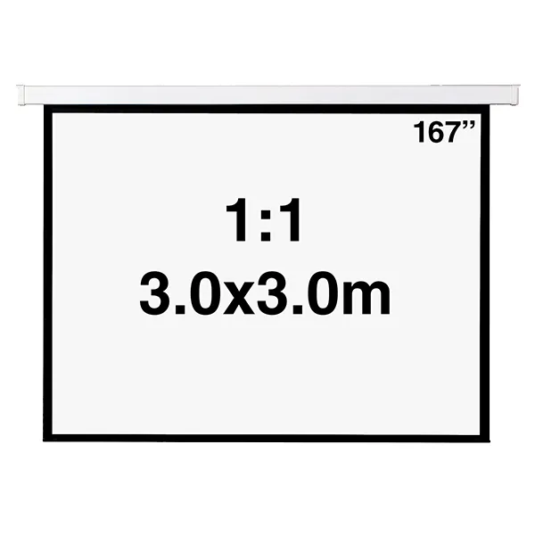 Suspensão Manual Possibilidade de fixação à parede e ao teto Blackout (costas pretas) 4 Black Borders (moldura preta) Tela Matte White Travamento de 15 em 15cm Relação 1:1 Medida: 167 Dimensão Imagem LxA: 3000x3000mm Dimensão Tela LxA: 3080x3305mm DROP: 4cm
