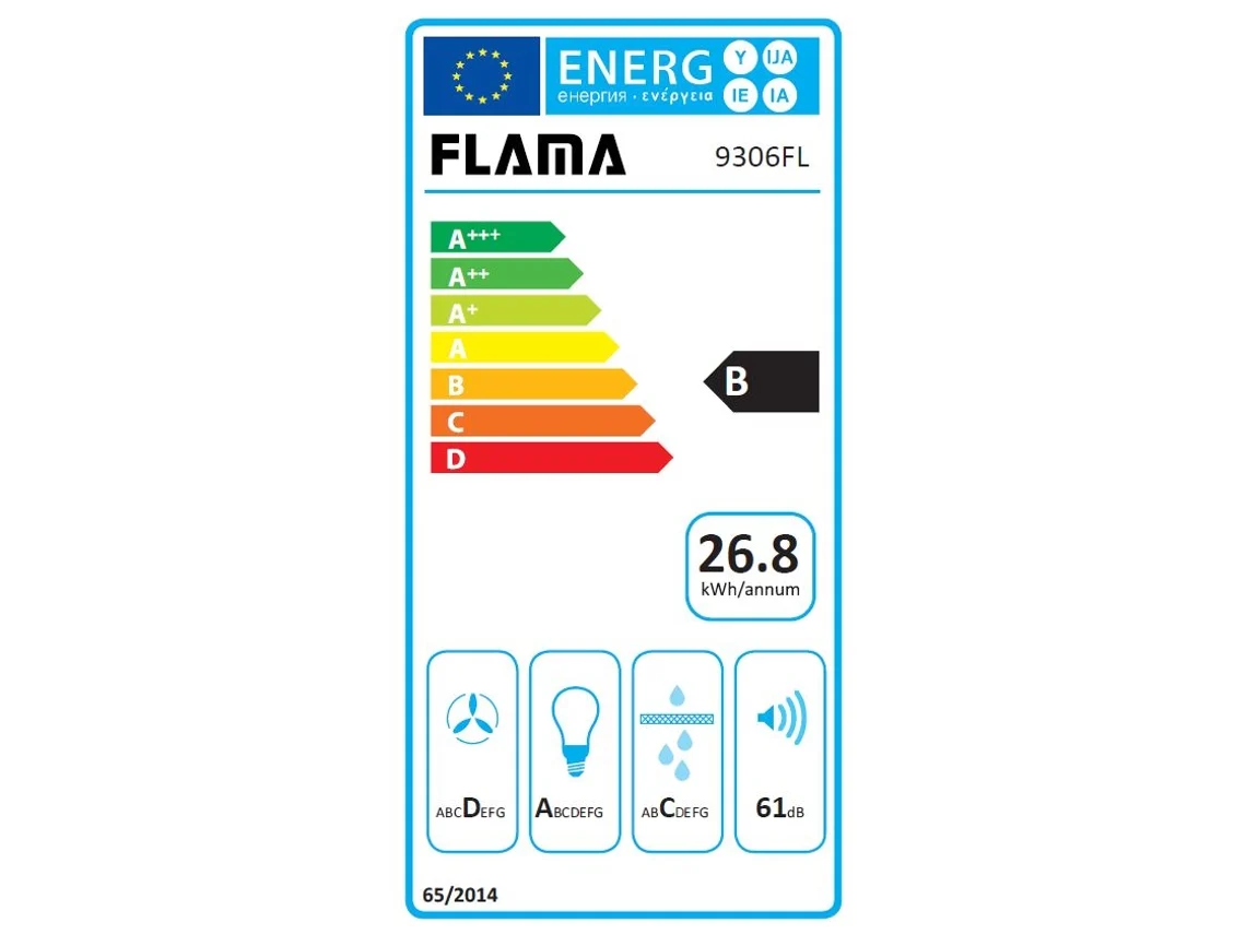 Tipo de exaustor: Standard Ø saída (mm): 600 mm Tipo de luz interior: LED Tensão (v): 220/240 v Frequência (Hz): 50 Hz Potência máxima exaustor (W): 66,5 W N.º de motores: 1 Potência do motor (W): 65 W Comprimento cabo ligação (cm): 80 cm Consumo de luz interior (w): 2 W Válvula anti retorno Dimensões: 60 cm x 49,2 cm x 14 cm Consumo anual de energia (kWh/a): 26,8 kWh/a Classe de eficiência energética: B Eficiência dinâmica dos fluidos: 15,8 Classe de eficiência dinâmica dos fluidos: D Eficiência de iluminação: 37 Classe de eficiência de iluminação: A Eficiência de Filtragem de gorduras: 77,7 Classe de eficiência de filtragem de gorduras: C Caudal de ar (velocidade mínima em utilização normal): 255 Caudal de ar (velocidade máxima em utilização normal): 351 Nível de potência sonora com ponderação A (velocidade mínima em utilização normal): 55 Nível de potência sonora com ponderação A (velocidade máxima em utilização normal): 61 Número de filtros: 2 Descrição do filtro: Aluminio 3 camadas Painel de comandos Número de velocidades: 3