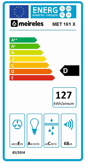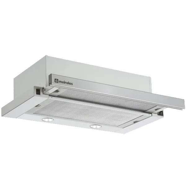 Exaustor telescópico de 60cm Aço inoxidável na guia e corpo Comandos por guia com botões escondidos Extracção máxima 425 m3/h 2 Motores 2 Lâmpadas LED Filtro de alumínio lavável Classe energética D