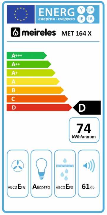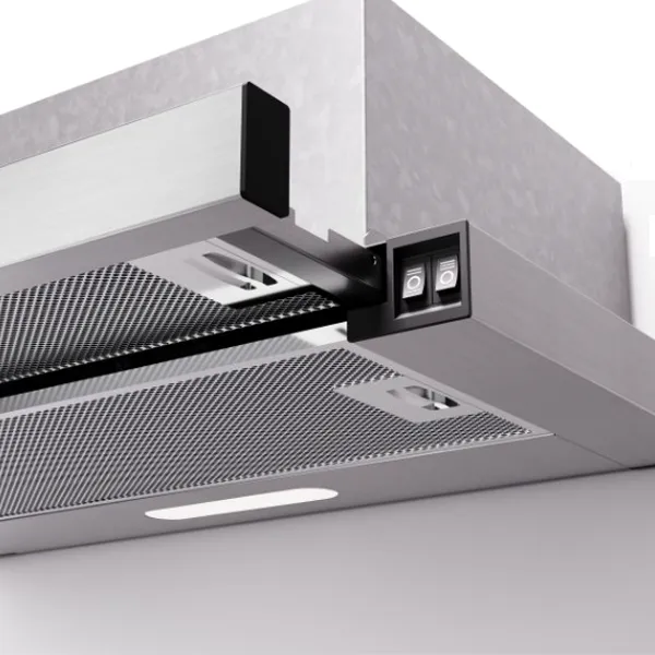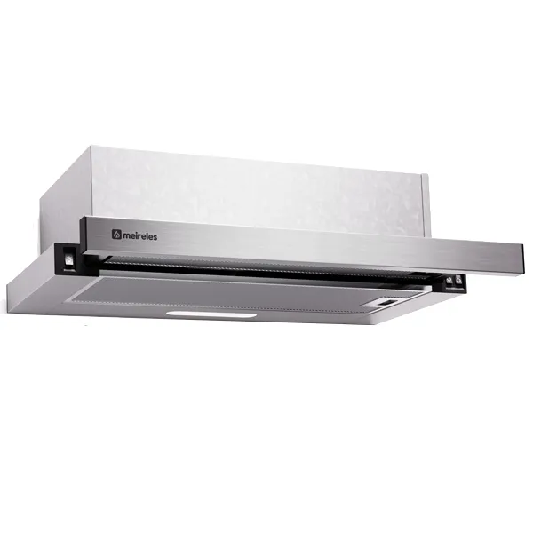 Exaustor telescópico de 60cm Aço inoxidável Comandos por guia com botões escondidos Extracção máxima 355 m3/h Lâmpadas de LED Filtro de alumínio lavável Classe energética D Dimensões (axlxp): 173x600x280mm