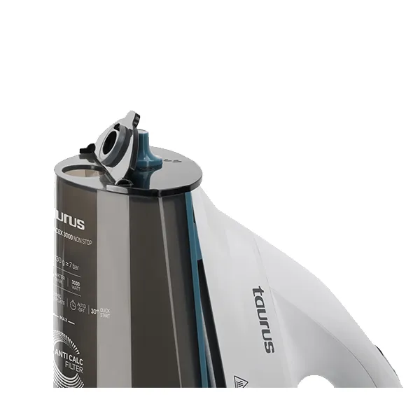 Potência: 3000W Cap. depósito: 1,3lts Sistema Non Stop para enchimento de água, prático e rápido: vapor pronto em 30 segs Vapor contínuo 130 g/min Jato de vapor eletrónico: 400 g/min Resultados equivalentes a um centro de engomar 7 bar Engoma na vertical Caldeira de água removível de 1,3lts Sistema de bloqueio patenteado para transporte Base cerâmica