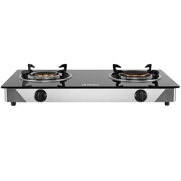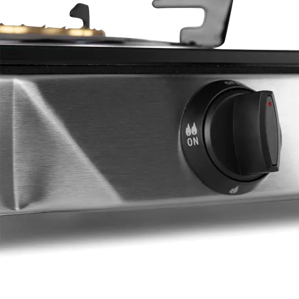 Corpo Inox Superfíce de vidro temperado negro Acendimento piezoelétrico Combustível: Gás butano e gás propano Tipo de gás G-30: Pressão 28-30 mbar Tipo de gás G-31: Pressão 37mbar Categoria I3+ Base antiderrapante 2 queimadores de tripla coroa Sistema de seggurança FFD (Flame Fail Device): anula a saída de gás no caso da chama se apagar involuntáriamente Fácil de limpar Queimador pequeno: 3,4kW Queimador grande: 4,3kW Consumo total de gás: 560.31 g/h Dimensões: 71x13x41cm Para uso interno e externo