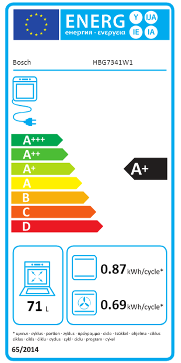 Classe de eficiência energética: A+ (numa escala de classes de eficiência energética de A+++ até D), Consumo de energia por ciclo na função de aquecimento convencional (ar quente): 0.87 kWh