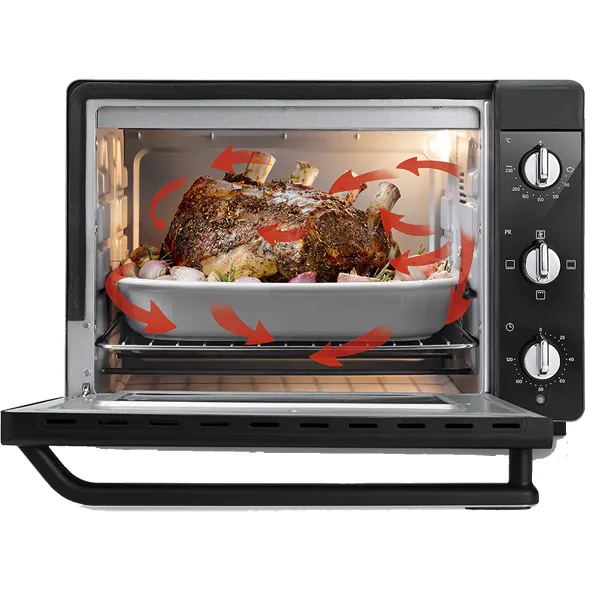 Peso (Kg): 11,4Voltagem/Frequência (V~Hz): 220-240 V / 50-60 HzCor: PretoControlos: 3 Dimensões externas (lxdxa) (mm): 515x440x360Dimensões max. prato redondo (cm): 33Paredes internas: Durastone IIPotência – Forno (W): 2000Potência – Grill (W): 1000Potência (W): 2000Temporizador (min): 120Termóstato (°C): 80 – 230Volume interno (l): 40Alerta sonoro de desligamento automático e pronto a usarFunção AssarPreparação de pãoBandeja para migalhasPorta de duplo vidroVentilador de convecçãoFunção Grill