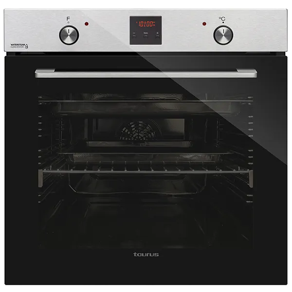 7 funções de aquecimento Com função grill, super grill e aquecimento ventilado Painel frontal em inox Comandos retráteis metálicos (PIPO) Puxador metálico Temperatura regulável até 270ºC Visor a LED vermelho, temporizador Digital e programador Porta em vidro duplo facilmente desmontável Sistema de limpeza “WaterSteam Clean System” Com grelhas laterais metálicas com 8 níveis Guias telescópicas Sistema de abertura “Soft Close” Classe de eficiência energética: A Acessórios incluídos: Tabuleiro fundo, grelha e tabuleiro suplementar para funções de vapor. Luz interior Indicador de temperatura Vidro de baixa emissão térmica Painel slim Dimensões (LxPxA): 59,5×57,5×59,5cm