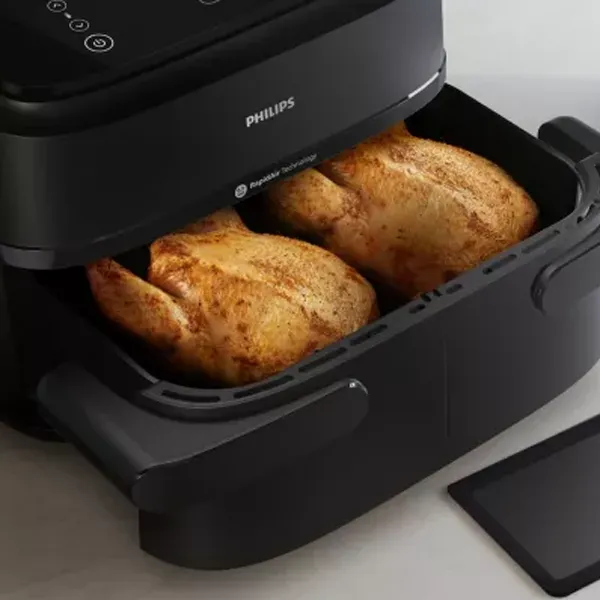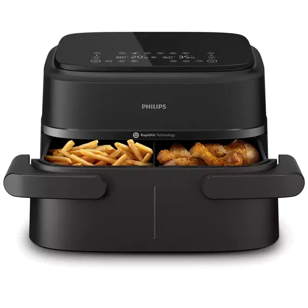 Potência: 2450 W Tensão: 220V-240V Frequência: 50Hz Capacidade: 7,1lts (3.55lts + 3.55lts) Pés antiderrampantes Interface digital – LED Cabo de alimentação: 0,8m Programas: 6 Temporizador até 60 min Tecnologia: RapidAir Desconexão automática Temperatura: 40-200ºC Dimensões 437,69×301,43×294,91mm Peso do produto: 5,8kg