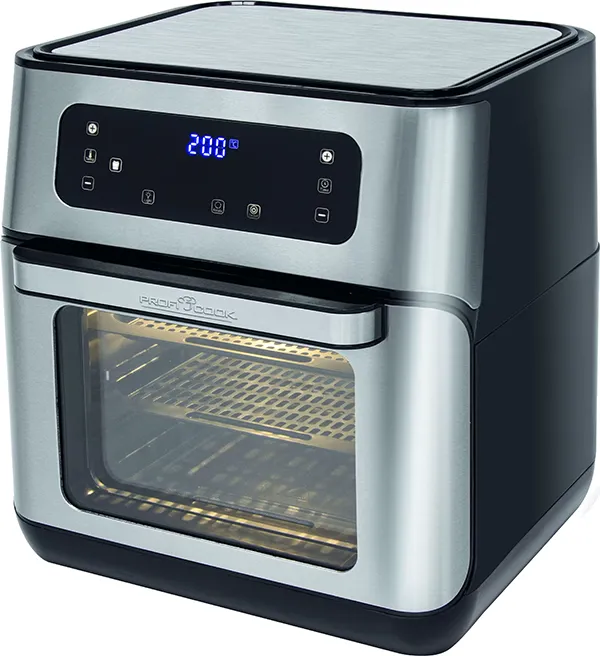 Acessórios incluidos: Cesto para fritar, 8 espetos rotativos para carne, 2 grades deslizantes, bandeja e ferramenta de extração.