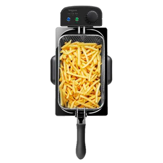 2000W Fritadeira em aço inoxidável Aquece rápidamente o óleo 3 lts de capacidade Cuba esmaltada com revestimento anti aderente Capacidade da cesta: 1kg de batatas Posição da cesta para escorrer o óleo dos alimentos Temperatura ajustável de 150ºC a 190ºC Resistência submersa Com tampa protetora Pega dobrável Desmontável