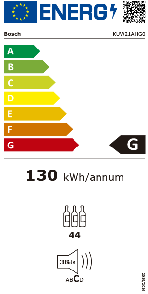 CONSUMO / CAPACIDADE Classe de eficiência energética: G Consumo anual de energia (kWh/ano): 130 kWh/ano Volume líquido total : 120 litros Emissão de ruído (dB(A) re 1pW): 38 dB