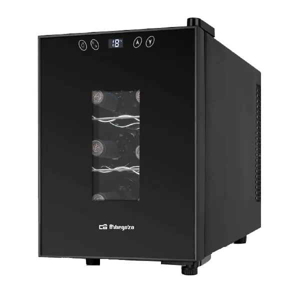 Potência: 55W Volume: 17lts, capacidade para 6 garrafas Totalmente silencioso e sem vibrações Não requer manutenção Refrigerante: R600a Luzes internas de LED Prateleiras cromadas removíveis Visor digital LCD e painel de controlo de toque Porta com puxador na lateral Controlo eletrónico de temperatura (11-18ºC) Temperatura em ºC e ºF Classe energética: G Consumo de energia (kWh/24h): 0,518 Função de descongelamento automático Pés ajustáveis Dimensões (LxAxP): 246x375x503mm Conexão: 230V ~ 50Hz