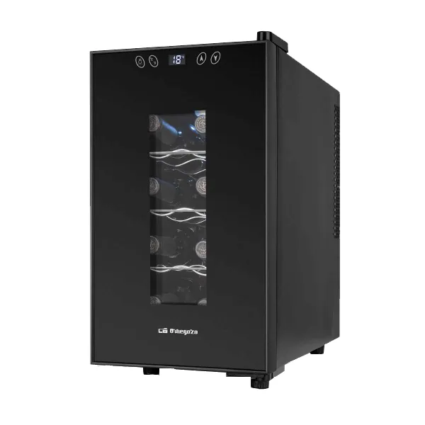 Potência: 70W Volume: 23lts, capacidade para 8 garrafas Totalmente silencioso e sem vibrações Não requer manutenção Refrigerante: R600a Luzes internas de LED Prateleiras cromadas removíveis Visor digital LCD e painel de controlo de toque Porta com puxador na lateral Controlo eletrónico de temperatura (11-18ºC) Temperatura em ºC e ºF Classe energética: G Consumo de energia (kWh/24h): 0,520 Função de descongelamento automático Pés ajustáveis Dimensões (LxAxP): 260x480x495mm Conexão: 230V ~ 50Hz