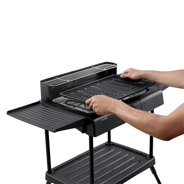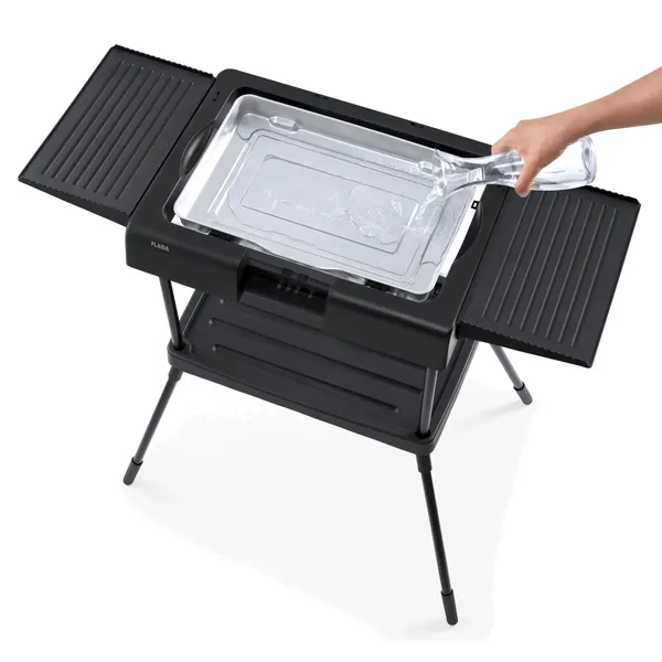 Potência: 2000W Forma da resistência: Zig-zag Tipo de superfície de confeção: Canelada Dimensão da superfície de confeção: 420 mm x 270 mm Microswitch Pés antideslizantes Pegas frias Componentes laváveis na máquina Comprimento do cabo (cm): 87,5 cm Material da superfície de confeção: Alumínio Revestimento da superfície de confeção: Antiaderente Grelhador 2 em 1: possibilidade de retirar os pés permite cozinhar dentro e fora de casa