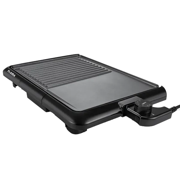 Cor: PretoMaterial: Alumínio e plásticoTipo de superfície: PlanchaRevestimento antiaderentePegas termo isolantesTermóstato regulávelBandeja recolha de gordurasPotência máxima: 2000WSuperfície de confeção: 360 mm x 255 mm