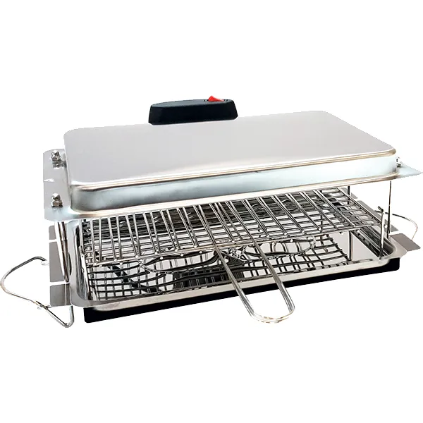 Potência : 1750 W Medida total (mm) : 560X330X200 Área de cozedura (mm) : 430X270 Tabuleiros em aço inox Resistência superior. Evita cheiros e fumos. 4 espetos para espetadas Grelha móvel de grandes dimensões. Peso apróx. : 4 Kg