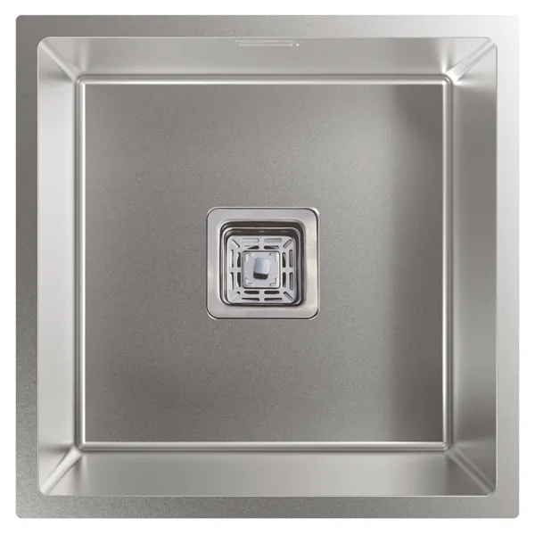 Cuba quadrada com raio de 10 mm Instalação em móvel de 50 cm Dimensões: 44 x 44 cm Profundidade da cuba de 25 cm Fundo de absorção de ruído Revestimento anticondensação Aço inoxidável AISI 304 18/8 Válvula com cesto 3 1/2” Grossura 1,2mm