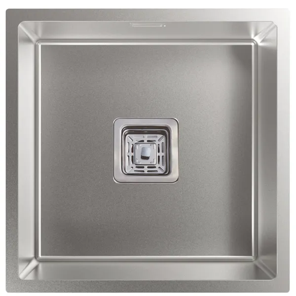 Cuba quadrada com raio de 10 mm Instalação em móvel de 50 cm Dimensões: 44 x 44 cm Profundidade da cuba de 20 cm Fundo de absorção de ruído Revestimento anticondensação Aço inoxidável AISI 304 18/8 Válvula com cesto 3 1/2” Grossura 1,2mm