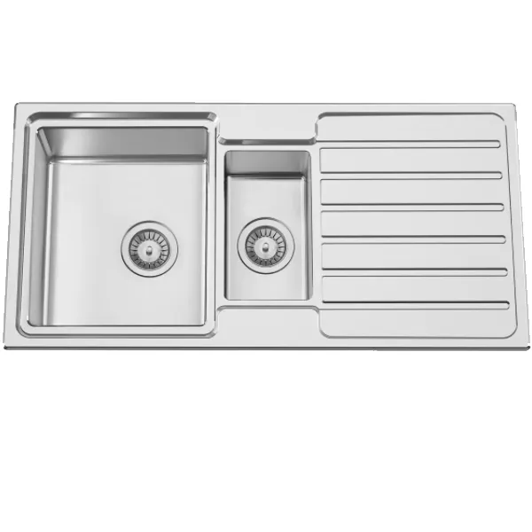 Medida externa:1000x500mmMedida das cubas:340×400/170x300mmProfundidade:200/170mmFornecido Com: Sifão/Válvula manual de cesta 0221110 + 02711Tamanho do móvel: 600mmAcabamento: Aço inox AISI 304Aplicação: encastrar