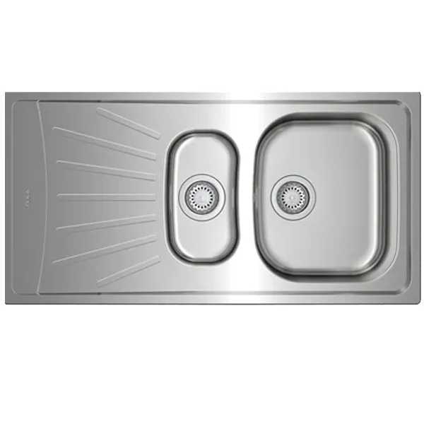 1 bacia de 340x400x160 mm 1 bacia de 170x320x160 mm Aplicação: encastrar Aço inoxidável 18/10 Válvula 3½” e sifão Móveis de 60 cm Dimensões (lxp): 980x500mm Cor: Inox