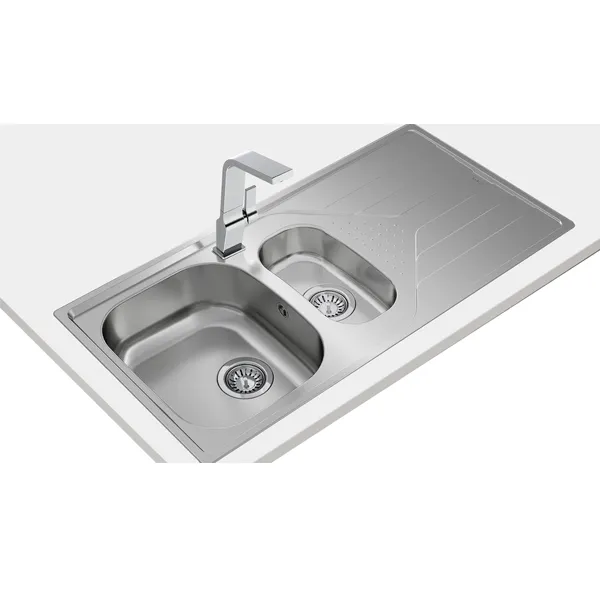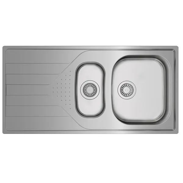 Encastre Lava-louças de uma bacia, bacia auxiliar e um escorredor Aço inoxidável 18/10 Válvula de 3 ½” Profundidade das bacias: 160 e 110 mm Reversível (sem furação): opção de ter o escorredor à direita ou à esquerda Móveis de 60 cm Medidas exteriores (lxp): 1000x500mm
