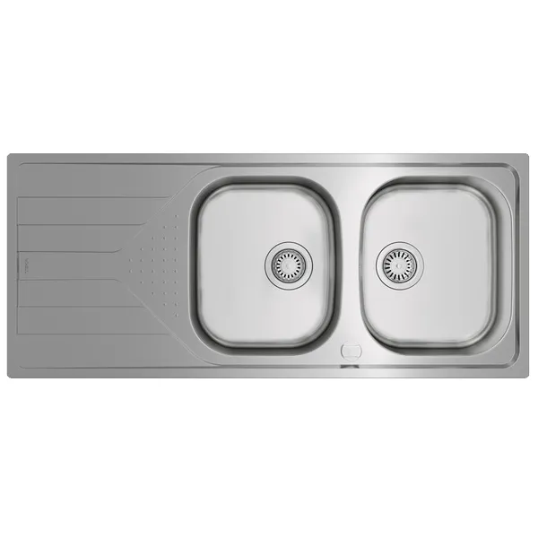 EncastreLava-louças de duas bacias e um escorredorAço inoxidável 18/10Válvula de 3 ½”Profundidade das bacias: 170 mmReversível (sem furação): opção de ter o escorredor à direita ou à esquerdaMóveis de 80 cmMedidas gerais (LxP): 1160x500mm