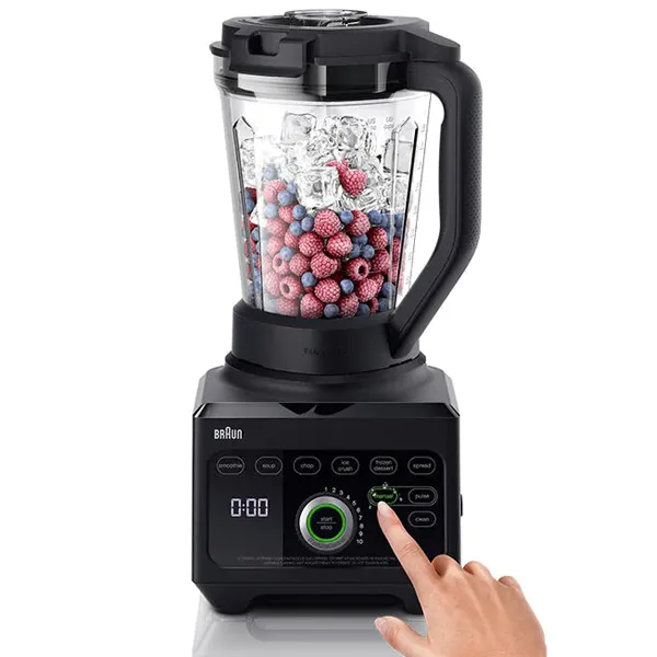 Tecnologia TriAction: Jarro triangular para circulação de mistura eficiente iTextureControl Material do jarro: Tritan™ Capacidade máxima: 3.0l Capacidade de trabalho: 2.0l Definições de velocidade: 10 opções de velocidade Função de pressão Programa de smoothies Programa de sopa e puré Copo de medição Copo de medição com função de gotejamento de óleo Programa para picar gelo Comprimento do cabo de alimentação: 100 cm Cor: Preto Peças que podem ir à máquina de lavar Rotações por minuto (RPM): 45000 Material da lâmina: Aço inoxidável Potência (W): 1600 Sistema de segurança Peças de contato com alimentos livres de BPA Armazenamento do cabo Dimensões do produto: 400 x 200 mm
