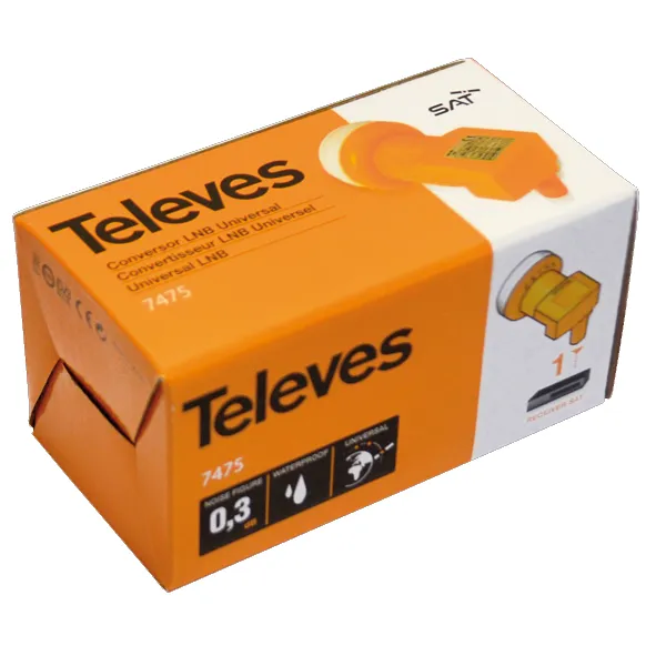 Conversor LNB single universal, de uma única saída com as quatro combinações polaridade/banda (Ha, Hb, Va, Vb). Desenho com impacto visual mínimo e com uma carcaça de reduzido tamanho Alto ganho Baixa figura de ruido Grande linearidade e equalização estudada Discriminação alta entre polaridades Grau de protecção muito elevado IP66 Válidos para temperaturas extremas Peso reduzido Compatível com suportes de 40mm Baixo consumo Alimentação através do receptor o do multiswitch Ligações simples Compatível com soluções multi-satélite Frequência de entrada (GHz): 10,7…12,75 Frequência de saída (MHz): 950…1950 (Banda Baixa) / 1100…2150 (Banda Alta) Tipo: Offset Nº de saídas – Polaridade e banda (H/V): Baixa Ganho (dB): 58 Figura de ruído (dB): 0,3 Osciladores locais (GHz): 9,75 (0KHz – Banda Baixa) / 10,6 (22KHz – Banda Alta) Conector de saída: Tipo F Tensão de alimentação ( Vdc): 12…20 Consumo máximo (mA): 90 Temperatura de trabalho (ºC): -30…+60
