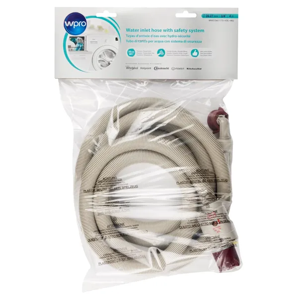 A mangueira para entrada de água com sistema de segurança da Wpro previne fugas e inundações. É adequada para máquinas de lavar roupa e de loiça. Dimensões: Ø 20,27 mm – 3/4" – 4 m.