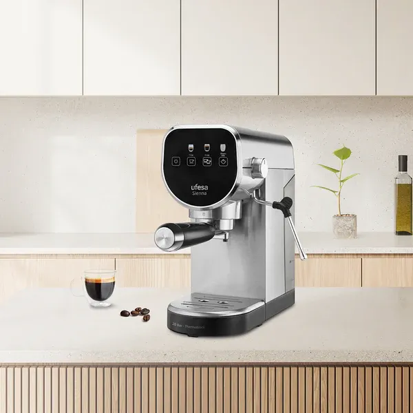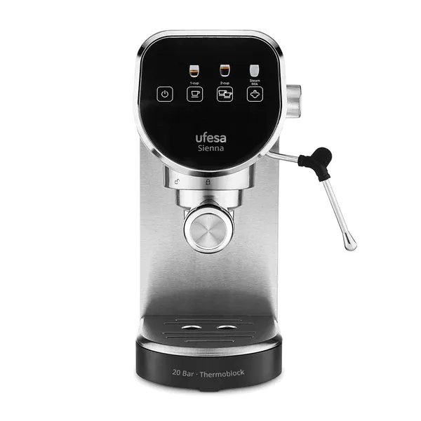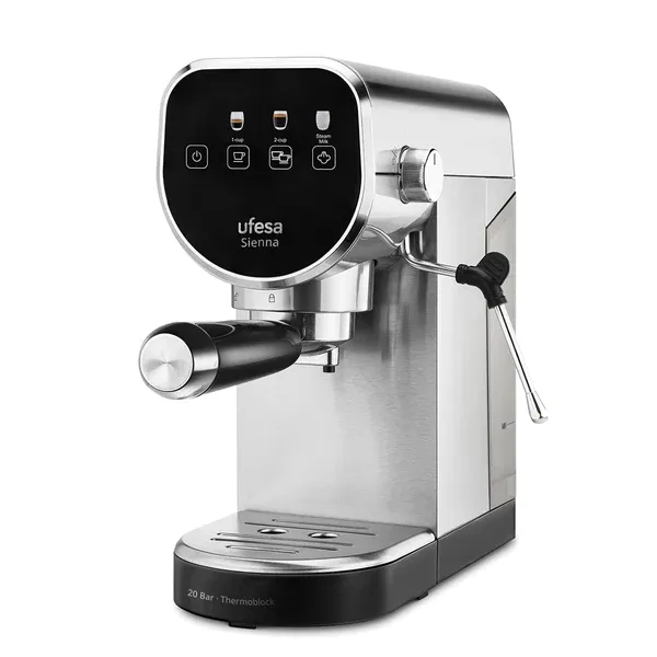 Ecrã tátil Potência: 1350W Pressão: 20 bar Sistema de aquecimento instantâneo Thermo-block Filtro de porta de 52 mm Depósito de água de 0,9 L Função de chávena simples/dupla Função de espuma de leite