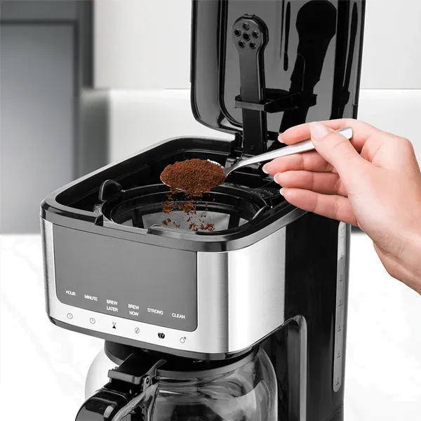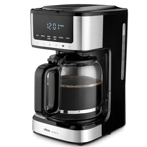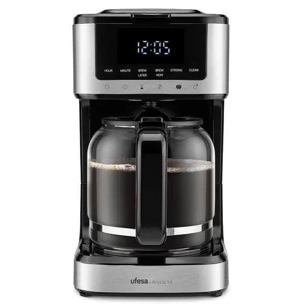 Capacidade: 14 chávenas 1,2 litros Controlo por painel tátil Suporte do filtro giratório e amovível Filtro permanente Placa de aquecimento antiaderente Válvula anti-gotejamento Desconexão automática Balde doseador de café Potência: 900W